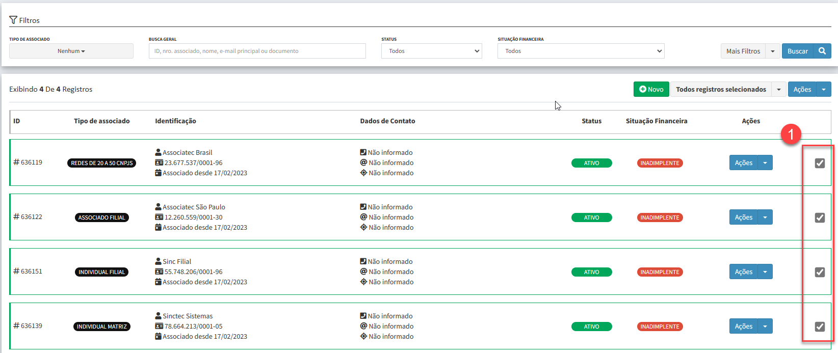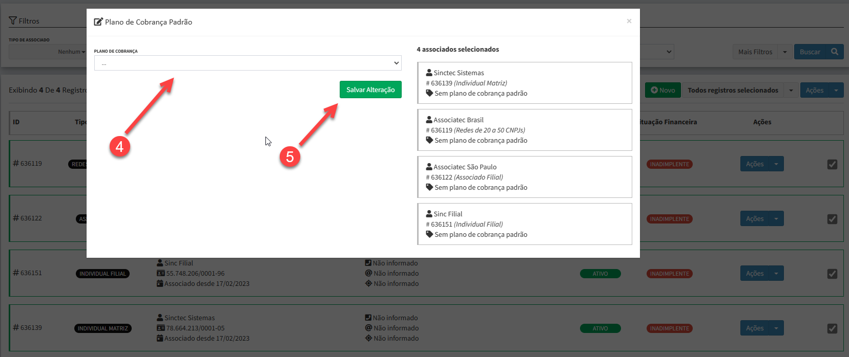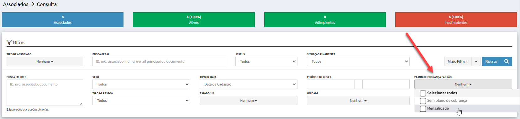 Da mesma forma que temos a possibilidade de filtrar o associado de acordo com o plano de cobrança padrão, agora é possível fazer a alteração do plano padrão de 2 ou mais associados de uma única vez.