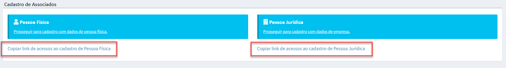 - Copiar link de acesso ao cadastro de associado, tanto pessoa física quanto pessoa jurídica. (Disponível em menu Associados > Cadastrar)