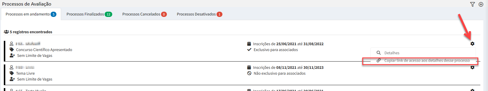 - Copiar link de acesso aos detalhes de um processo de avaliação. (Disponível em menu Processo de Avaliação > Gestão).