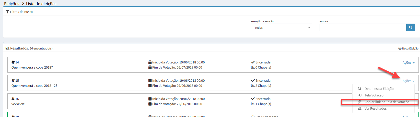 - Copiar link de acesso a tela de votação para cada processo de eleição criado. (Disponível em menu Eleições > Gestão de Eleição).