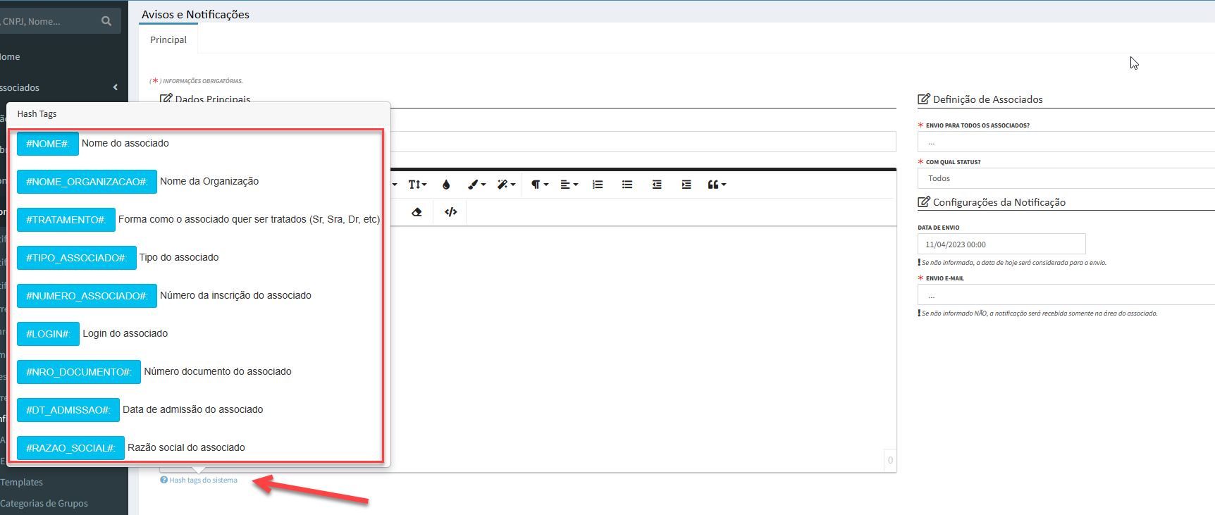 Ao criar um nova notificação avulsa no sistema (menu Comunicação > Notificações), é possível adicionar hastags que serão substituídas pelas informações de cadastro do associado. As hastags disponíveis estarão sempre visíveis na página de criação da notificação: