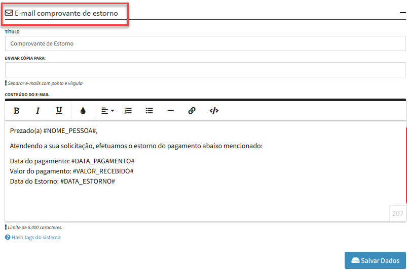 Ao realizar o estorno de pagamento de uma contribuição agora é possível enviar o comprovante de estorno por e-mail. Para editar a mensagem padrão de email acesse o menu Financeiro > Configurações > E-mails. Em seguida edite o campo “E-mail comprovante Estorno”