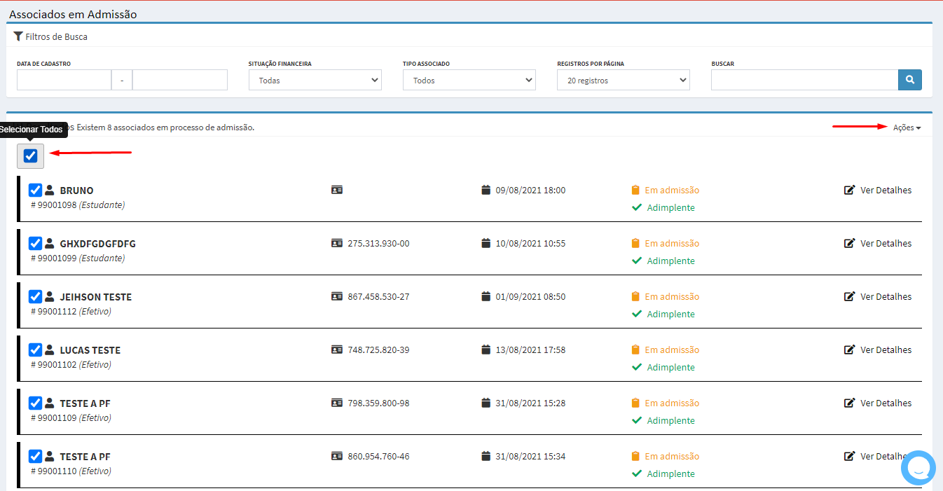 Sim, para realizar esse processo procure o menu Associados > Em admissão. Em tela será listado todos os associados que estão em admissão, primeiro selecione todos associados e após procure o botão “Ações”.