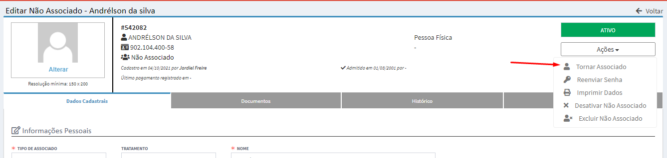 Sim, entre no cadastro do não associado e no botão “Ações” clique na opção Tornar Associado.