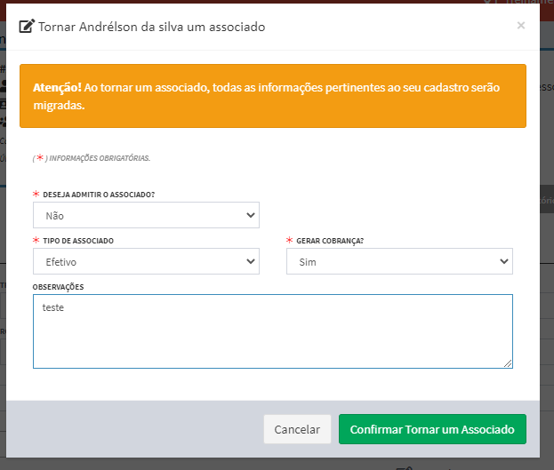 Antes de concluir o processo, será necessário informar o tipo/categoria, se deseja admitir ou até mesmo gerar uma cobrança ao associado em questão. E por fim, clique no botão de confirmar tornar um associado.