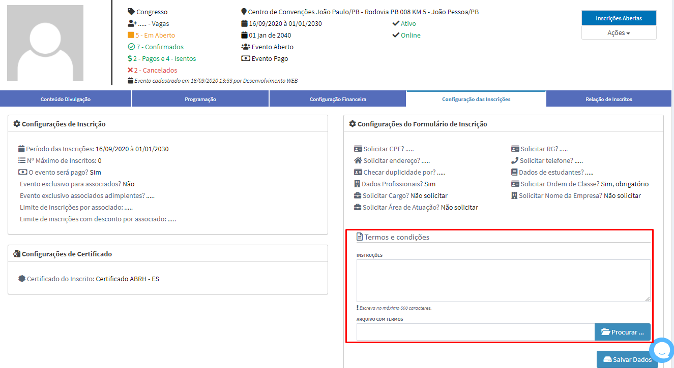 Sim, procure o evento já configurado e na aba de “Configurações das Inscrições” terá um espaço destinado aos termos e condições, possibilitando detalhamento de instruções e a inserção do termo.